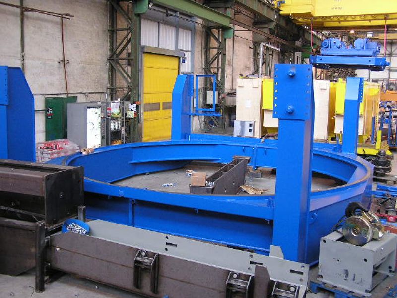 Conjunto compuesto de bastidor fijo y bastidor giratorio de 6 metros de diametro de giro, para grua de laminacion. Carro abierto suspendido con una capacidad de elevacion de 2 x 20 Tn.